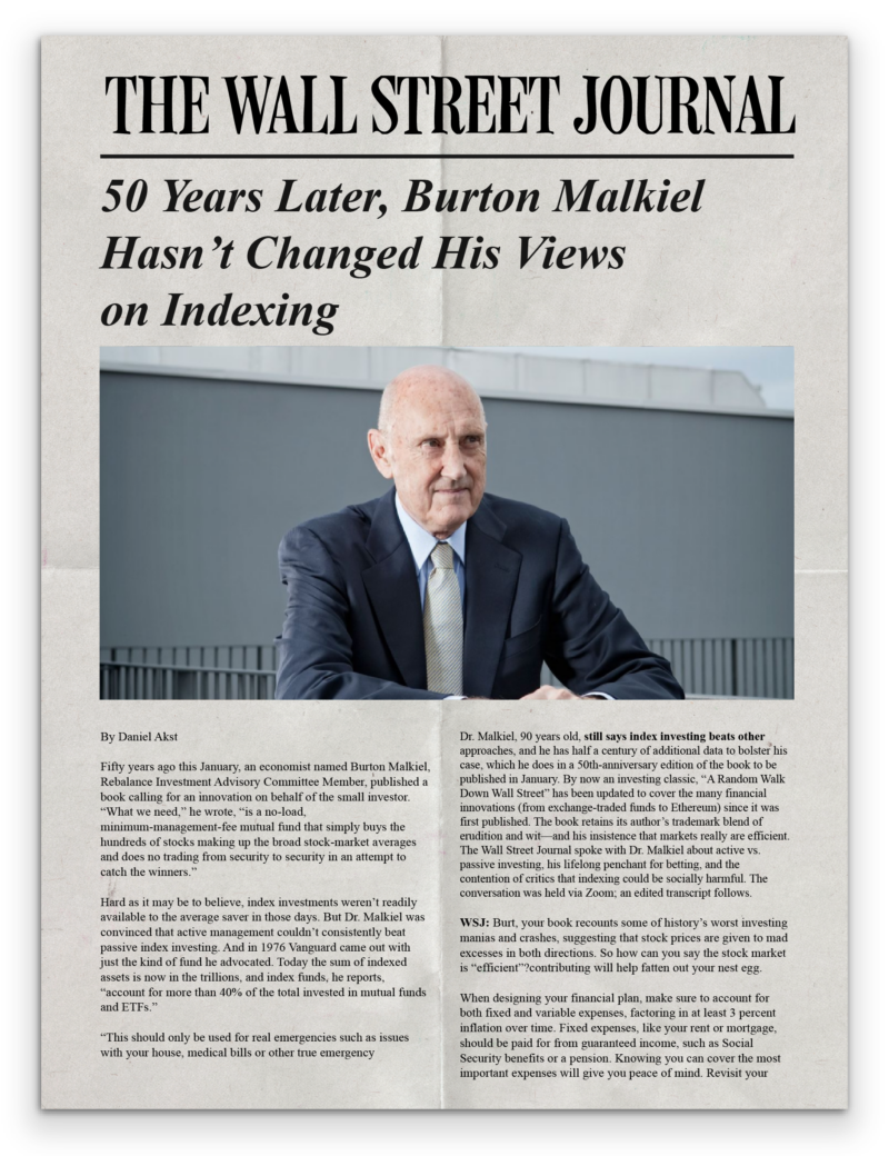 Professor Burton G. Malkiel is the Chemical Bank Chairman’s Professor of Economics, Emeritus, and a Senior Economist at Princeton University. A prolific author and highly respected voice in the investment industry, Professor Malkiel has written hundreds of scholarly articles and opinion pieces in publications such as The Financial Times, The New York Times, and The Wall Street Journal, and has authored no less than 17 books. Among those is the investment classic, A Random Walk Down Wall Street. Now in its 10th edition, this seminal work has sold more than 1.5 million copies and has played an important role in encouraging the use of low-cost, diversified “index funds” by institutional and individual investors. These are fundamental components of the Rebalance investment platform and methodology.