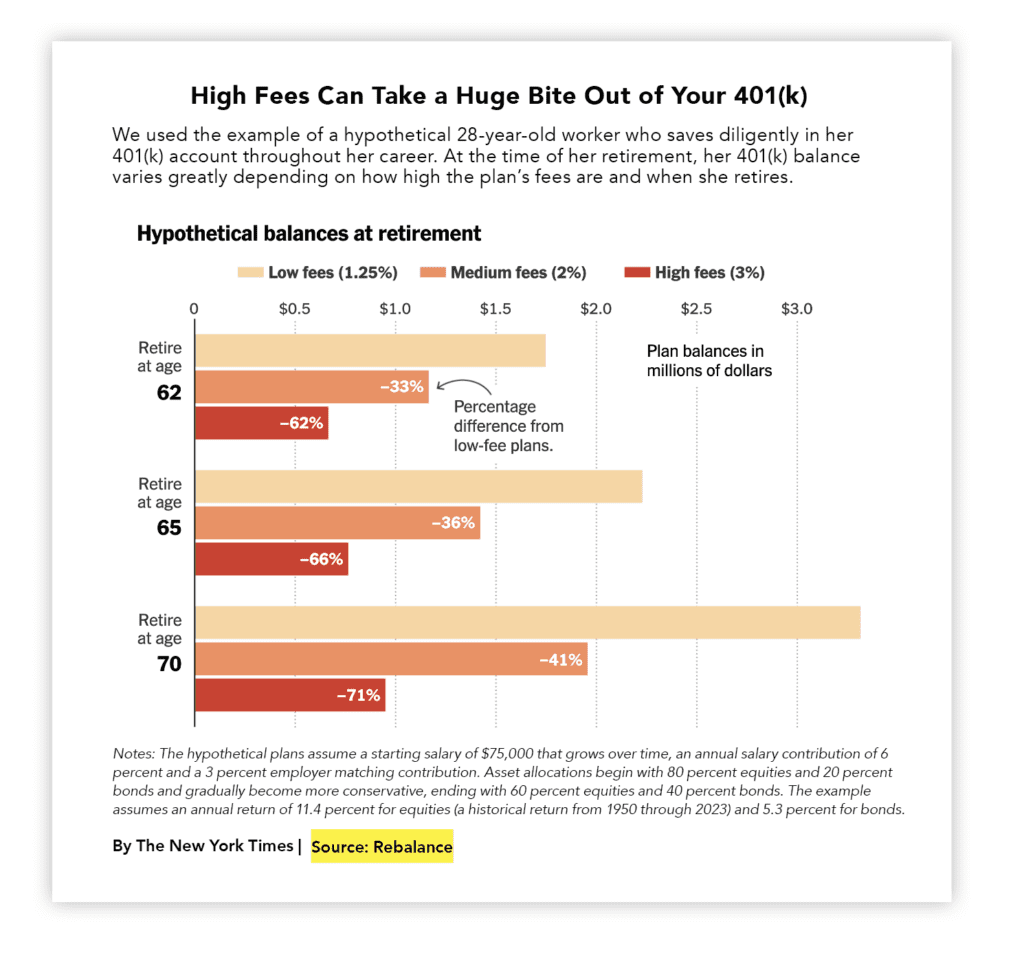 The New York Times worked with Rebalance to create a hypothetical example, illustrating the career-long effect of plans with a variety of fee levels.